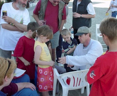 Today we're having a big beach party... in December just because we can! Look at that glorious sunshine. In the morning, Moira, Jim, Fiona, Glen, Sean, Lee, Erin, Dad and Charley went for a stroll up to the Amusement Park nearby and had a great time on the rollercoaster and dodgems. Some of them enjoyed the rollercoaster ride so much, they went for another one! I got busy in the kitchen again preparing Shish Kebabs, Steaks, Barbecued Chicken Drumsticks, Tuna-Pasta and Salad. Several special friends came over to join in the fun: Allen, Tracy and their sons Michael and David, Keith and Marge, Stephanie, Lee and friends... and professional magician Jeff Smith. Jeff put on an impromtu magic show that we all enjoyed very much! Later Ty and I did one of our "Name That Tune" contests and then the adults played another great round of Pictionary. Ah, what a grand day! |